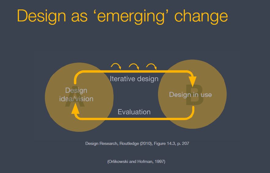 Design problems can be understood as emerging change. In order to fully span this space, research has to incorporate a deductive/ design element as well as an inductive/ feedback element. As a researcher, I have developed an extensive toolbox of theories and methods which allows me to select among a variety of theories, qualitative and quantitative methods and data gathering tools.